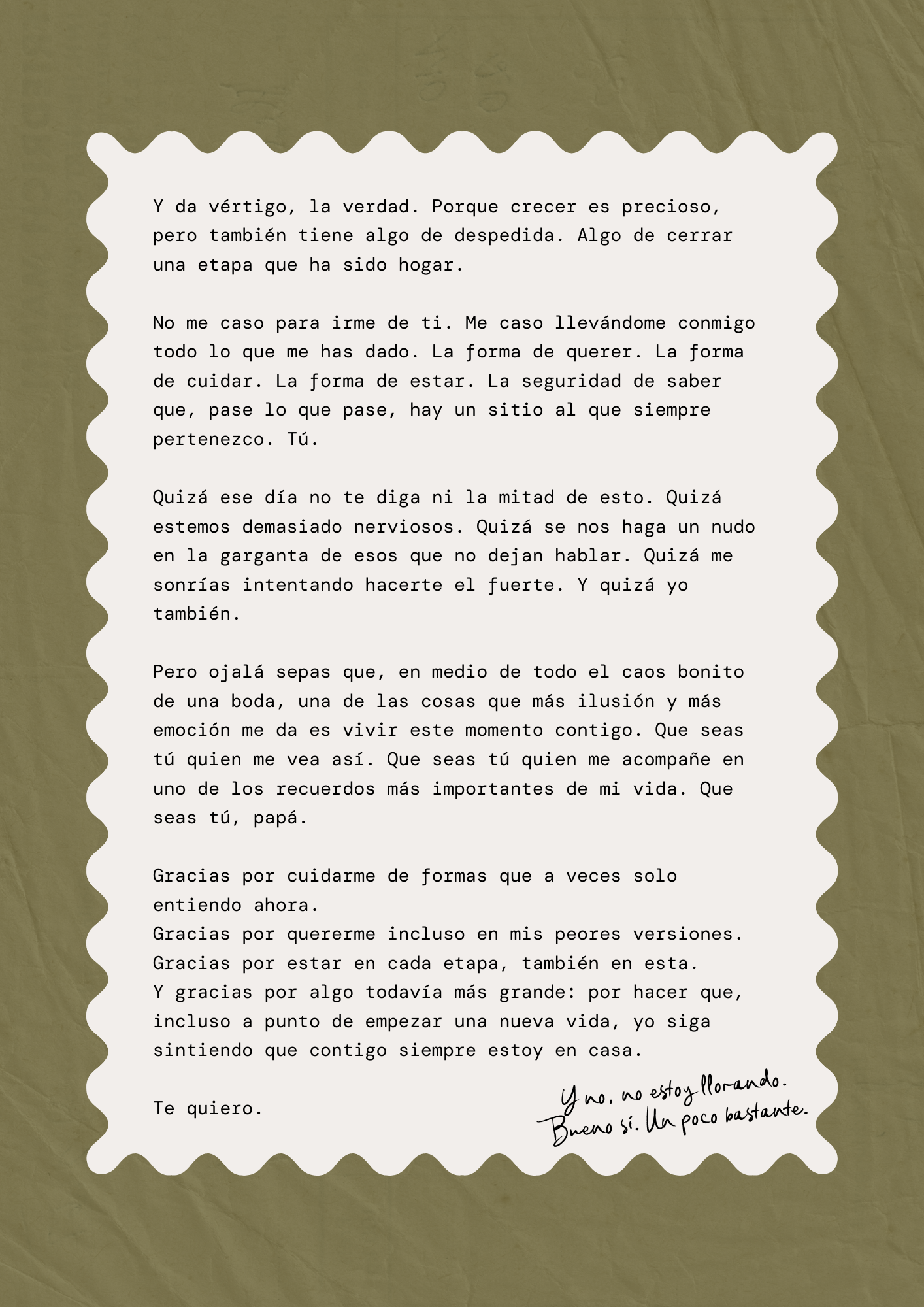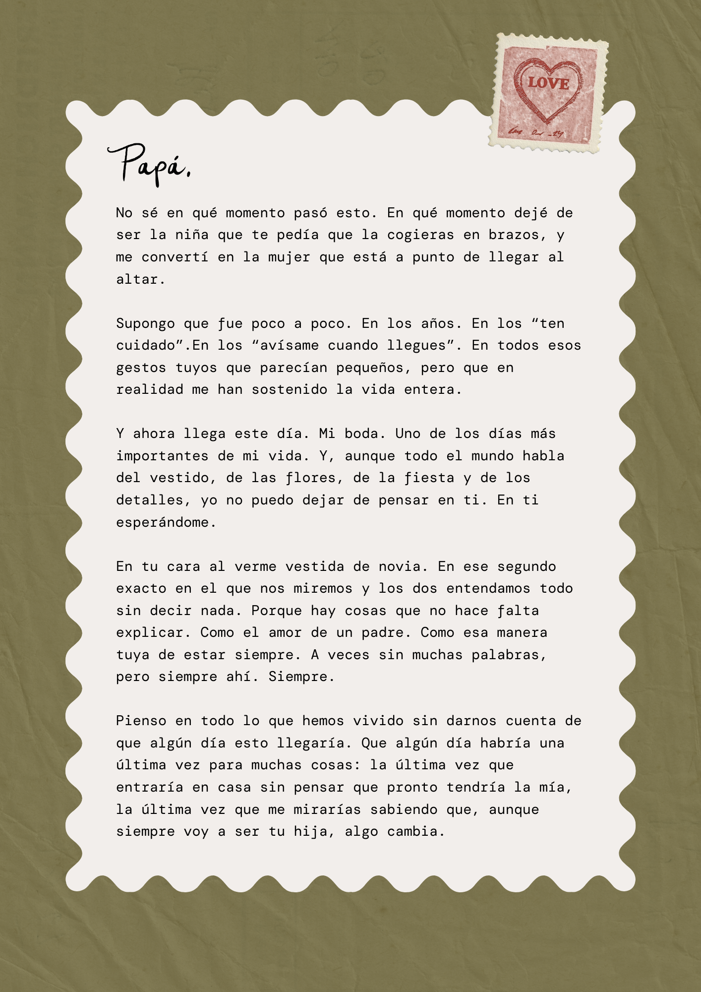 Esta carta recoge todo lo que muchas de nosotras sentimos en nuestro gran día, y es un recordatorio de lo invisible pero más importante: ese amor silencioso, esos gestos que no se dicen pero que lo dicen todo… y esa mirada de tu padre que, por un instante, lo cambia todo.